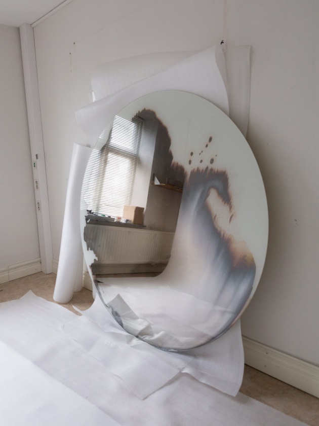 Η συλλογή καθρεφτών που παράγονται σε στρογγυλό και τετράγωνο σχήμα είναι αποτέλεσμα μια ιδιαίτερης χημικής αντίδρασης που εκμεταλλεύεται η σχεδιάστρια. Ουσιαστικά, το υγρό ασήμι που χρησιμοποιεί η Nordberg αναμειγνύεται με ένα χημικό διάλυμα και έπειτα διοχετεύεται σε μικροποσότητες πάνω σε γυάλινα κομμάτια. Και κάπου εκεί τελειώνει ο “ρόλος” της designer, αφού η χημική αντίδραση κάνει το… θαύμα της! Το μείγμα πολύ σύντομα εξατμίζεται, αφήνοντας ένα πολύ λεπτό στρώμα από ασήμι, παίρνοντας εντελώς διαφορετικά μοτίβα.